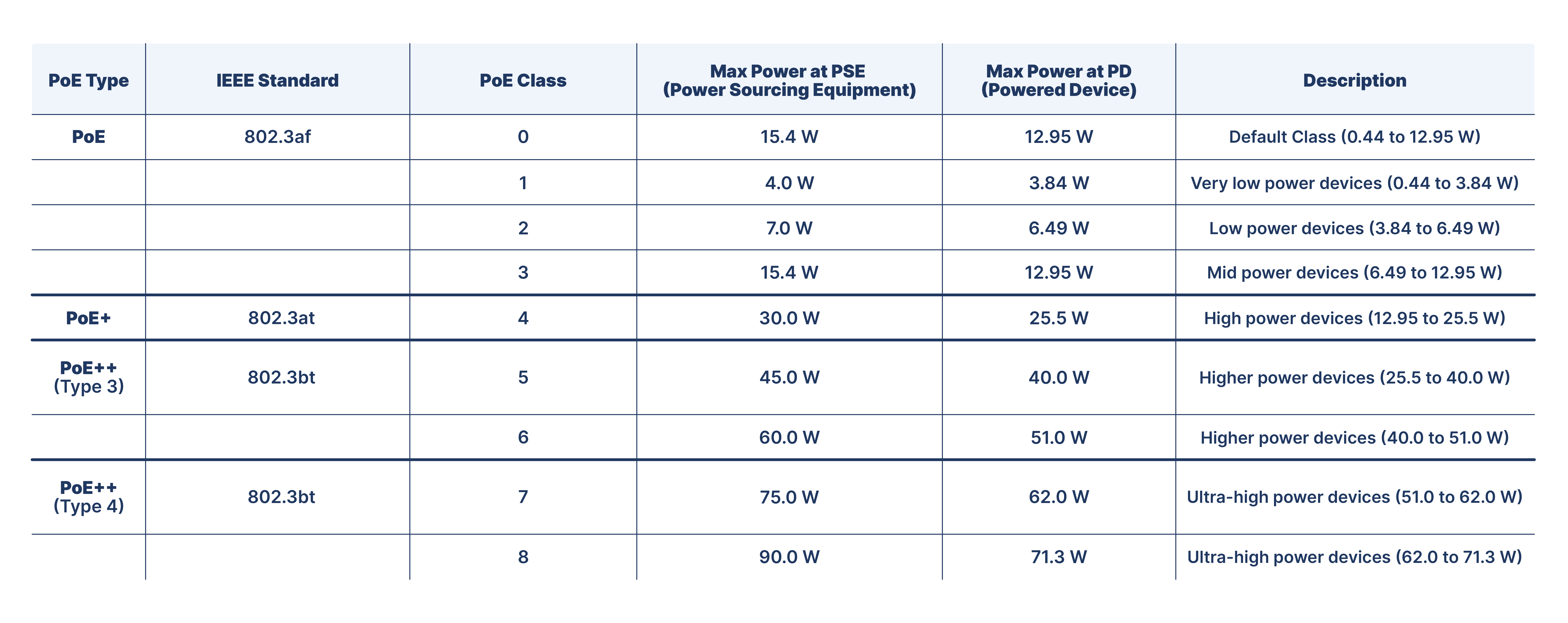 Each class within these standards specifies the maximum power that can be delivered to a powered device (PD), and the maximum power that can be drawn from the power sourcing equipment (PSE), ensuring compatibility and efficient power management across various devices and applications.