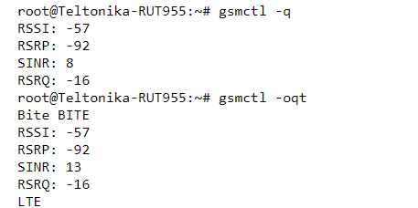 For example, try using gsmctl -q to get the current signal levels value in dBm. You can also combine options. For example, gsmctl -oqt: