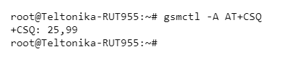 To use a specific AT command via SSH, you can use the gsmctl -H. After this, your console will enter shell mode where you can then just type AT commands in their regular format. Or you can use gsmctl -A <AT_COMMAND> to execute AT commands one at a time. Continuing from the example above, let's say you want to find out the RSSI value. While there are quite a few commands that can be used to achieve this goal, lets use the AT+CSQ that is used when executing gsmctl -q: