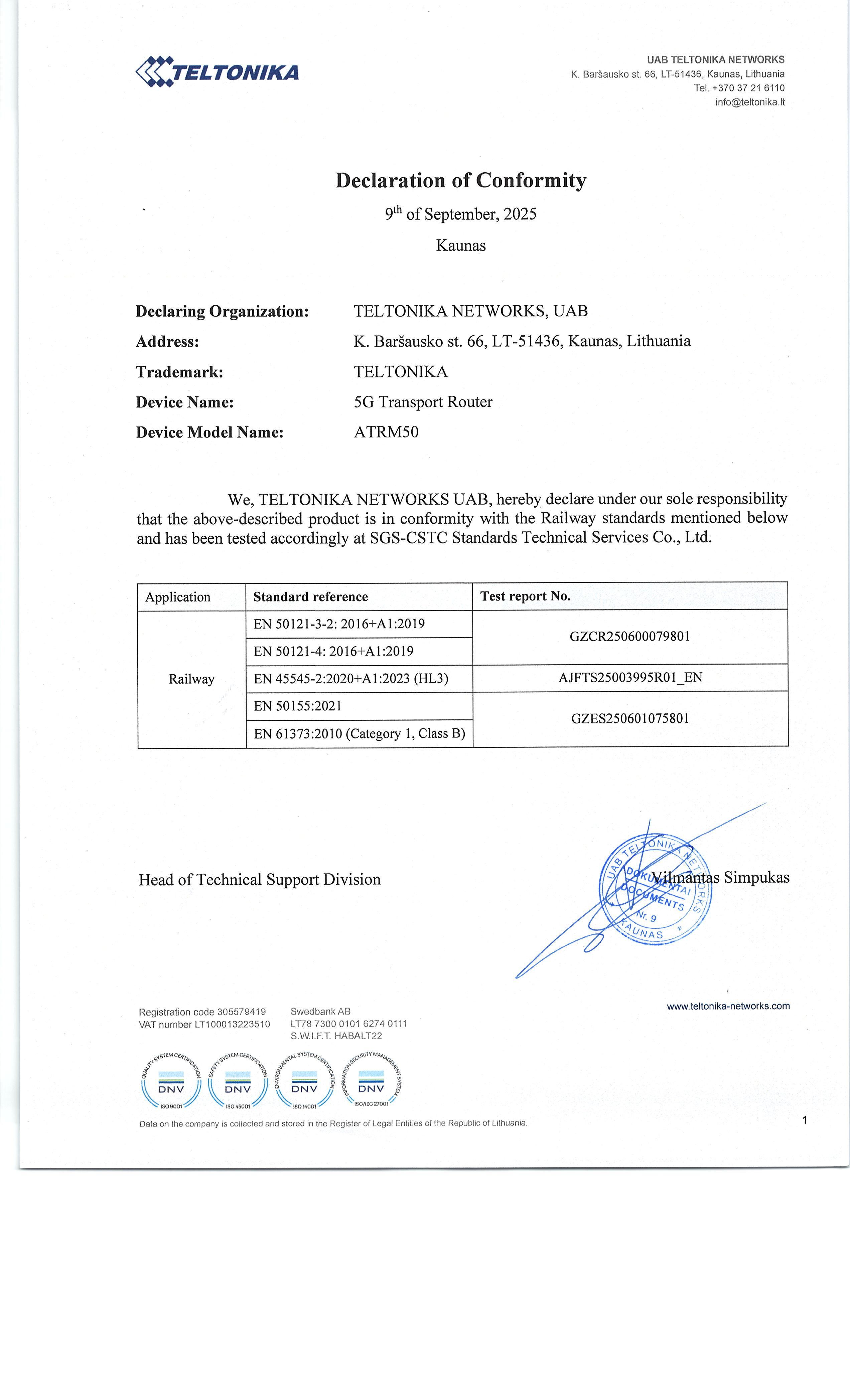 ATRM50 devices are certified for Railway use and tested accordingly: