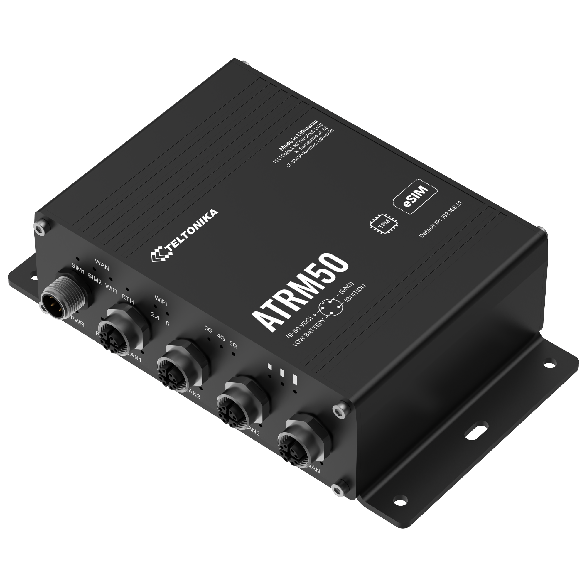 ATRM50 is a robust industrial 5G router equipped with 4x M12 Gigabit Ethernet ports, WiFi, Dual-SIM with eSIM, GPS, a powerful CPU and RutOS software for advanced networking solutions.