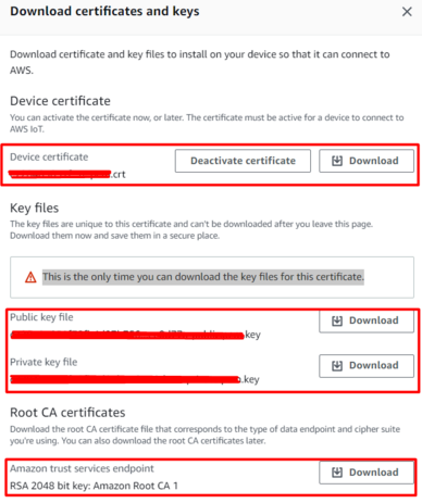 You will be prompted to download the certificates, download the "Device certificate", "Private key file, "Public key file" and "Amazon Root CA 1".