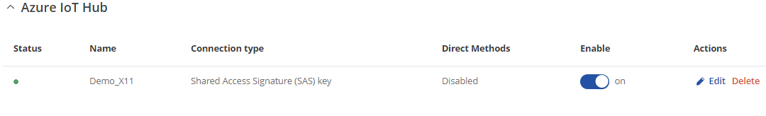 By default, all configuration instances will have this option disabled. To enable it, navigate on the router WebUI to Services -> Cloud Solutions -> Azure IoT Hub and press the edit button on the specific instance. Afterwards the "Enable Direct Methods" option needs to be enabled.