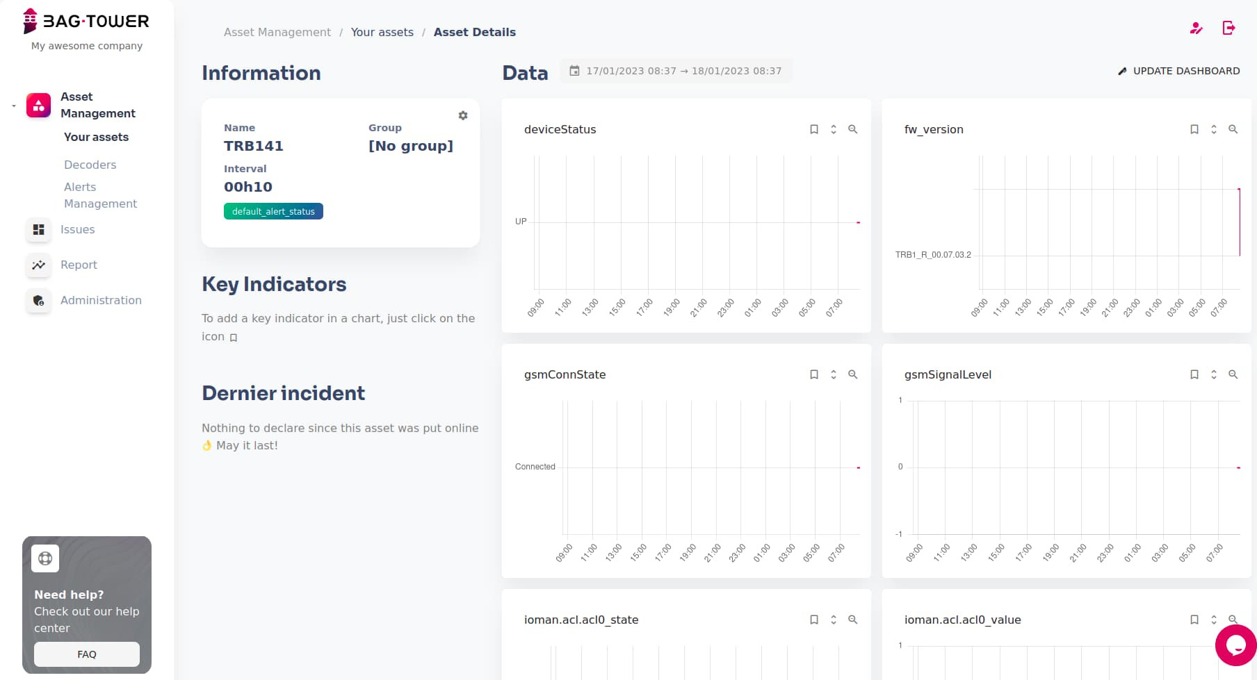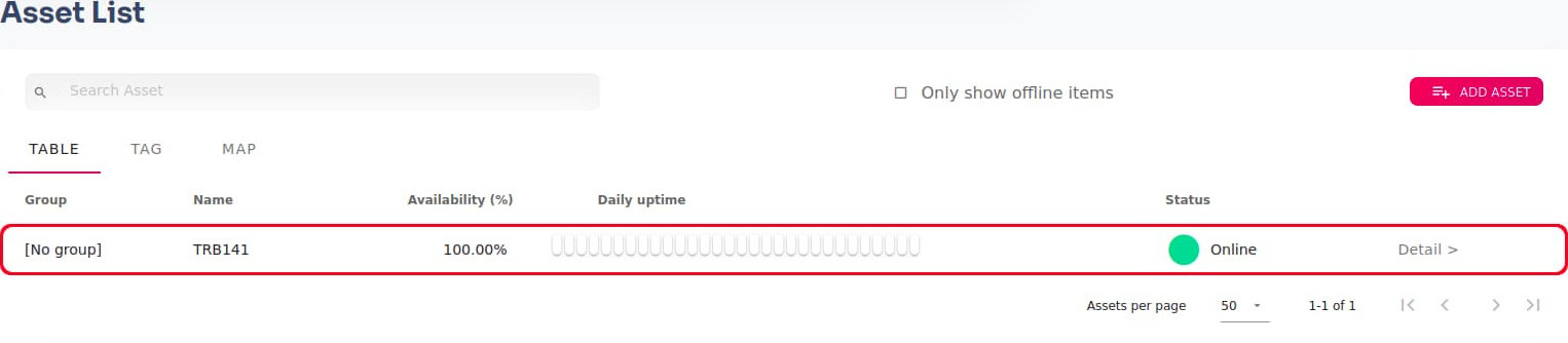If everything was done correctly now you should be all set and your device information should now periodically update in the Asset Details page. Your Teltonika-Networks device asset in BAG·Tower platform should now be shows as Online and its Detail page should now show graphs with information from that device.