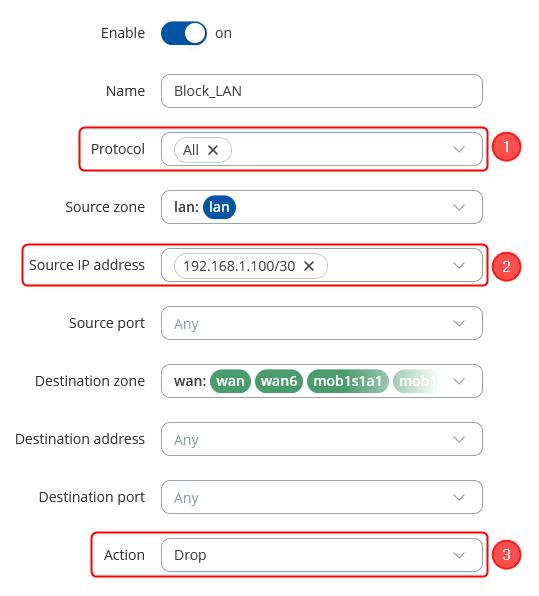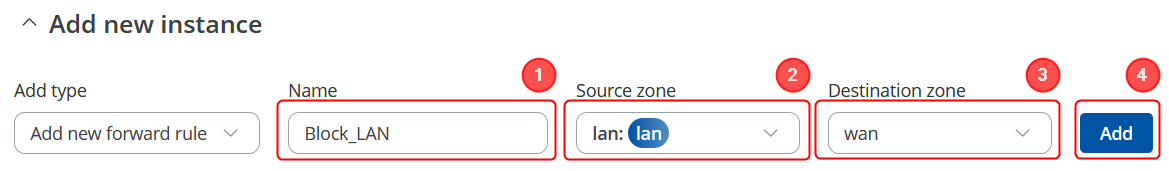 - Set 'Source Zone' to lan.