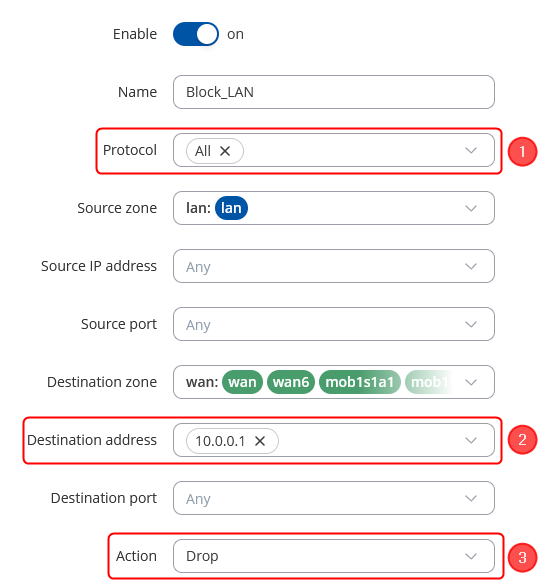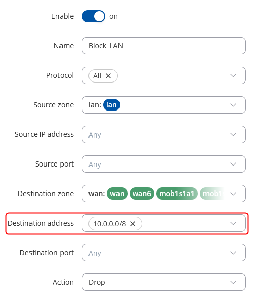 - Set 'Destination Zone' to wan.