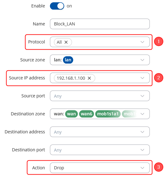 - To block all LAN clients from accessing specific IP address, set up the rule like this: