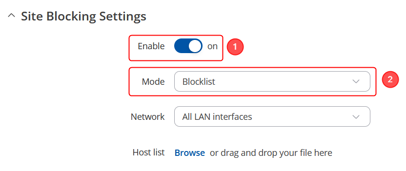Alternatively, you can set 'Mode' to Whitelist to allow access only to specific sites and block access to all others. - Specify sites that you wish to block under the 'Site Blocking Rules' section.