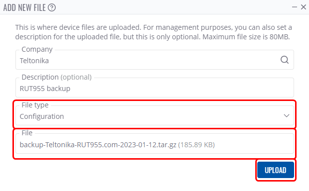 You can upload configuration backup files to your device if they were generated on an identical device using the same or an older firmware version (backup files created on devices with newer firmware cannot be uploaded to devices using an older firmware version).
