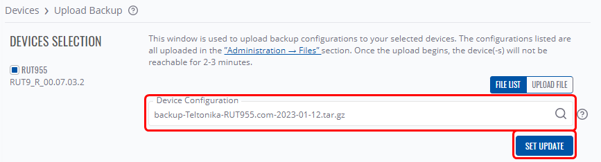 You can also upload the same configuration backup file to multiple devices at once using the same method. Simply select however many devices you wish to upload to and click Upload backup.