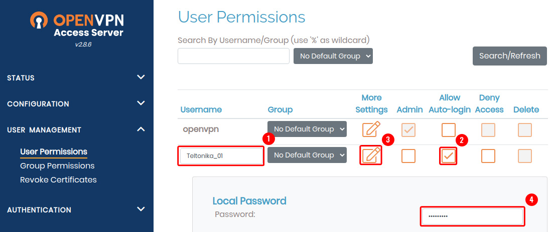 In order to manage your users on OpenVPN Access Server navigate to User Management -> User Permissions