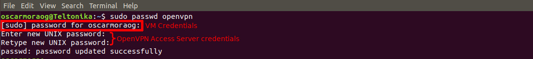 Enter Linux machine password and then the password for OpenVPN Access Server administrator account, (see picture