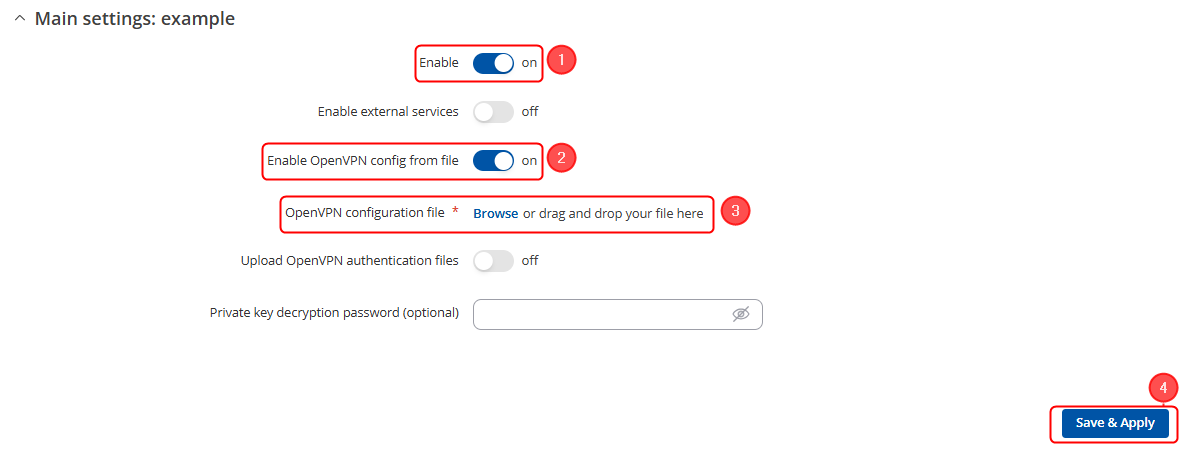 At this point you should have configured OpenVPN Access Server and you should have the .ovpn configuration file. Now you will need to upload it to the RUTX11 device OpenVPN configuration.