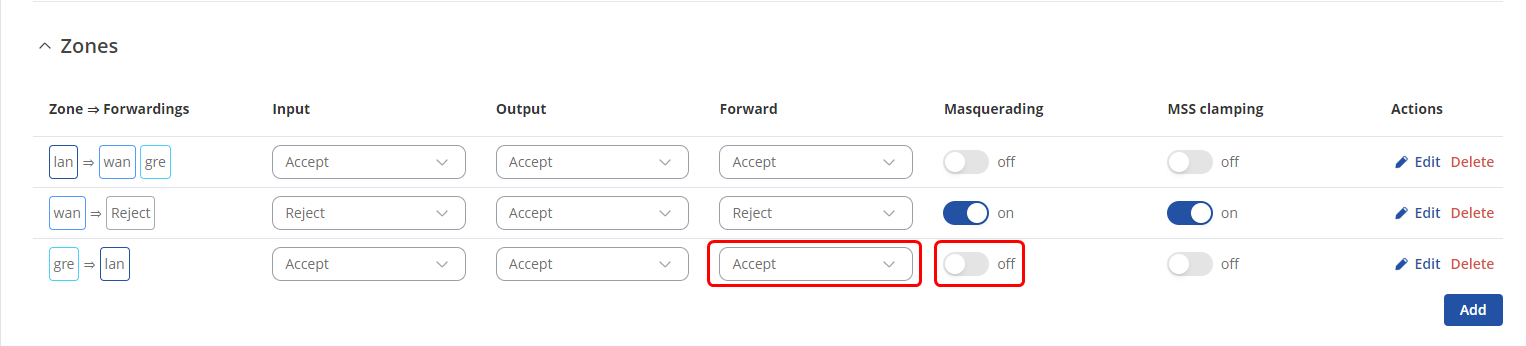 Navigate to Network -> Firewall -> General settings -> Zones, set GRE zone to forward traffic to LAN and disable masquerading.