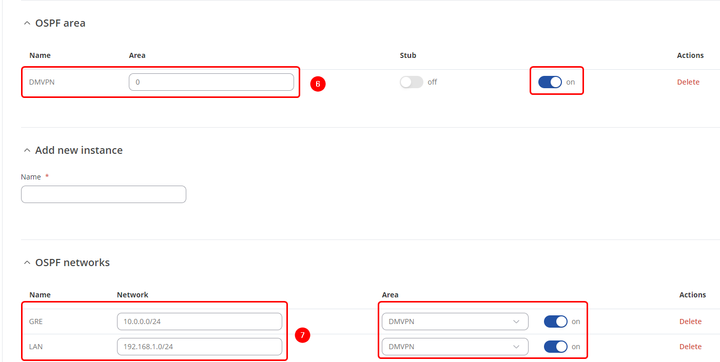 - 6. OSPF Area - Create an entry, input 0 to the Zone parameter and enable it