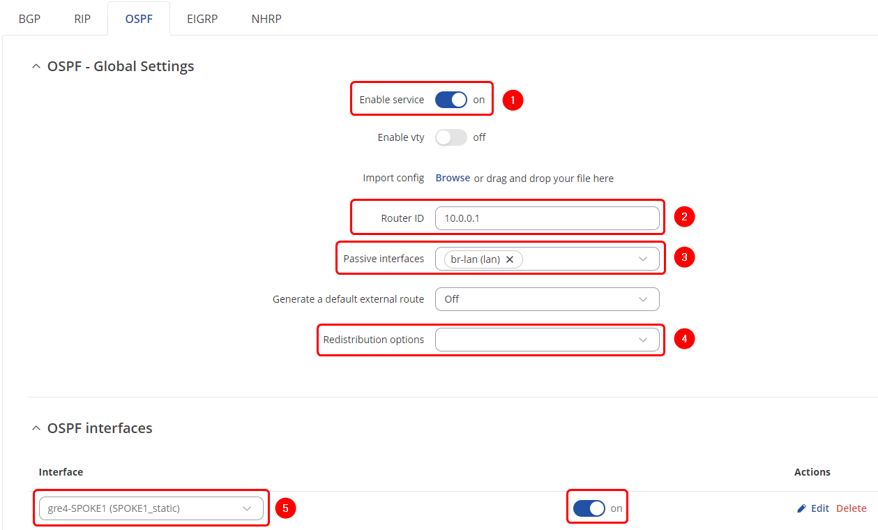 On the Spoke1 router, navigate to Network → Routing → Dynamic Routes → OSPF and configure OSPF as shown: