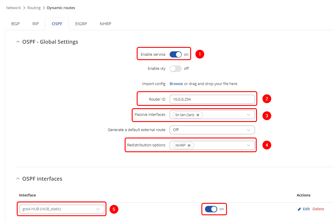 On the Hub router, navigate to Network → Routing → Dynamic Routes → OSPF and configure OSPF as shown: