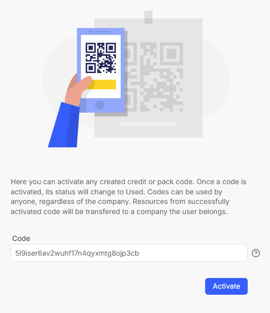 - If the code is valid, you will receive status message "Activate operation completed successfully" and resources will be available on the company the user belongs to (can be seen in the account menu under email), to view this quickly simply click on Resource summary and you will see the increase in resources after code activation.