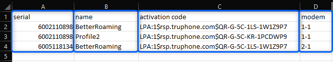 - In the file, you need to input: serial number, profile name, eSIM profile's activation code and modem ID to which the profile will be applied.