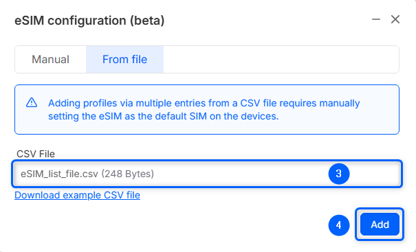 - From file - for configuring a list of eSIM profiles to single or multiple devices.