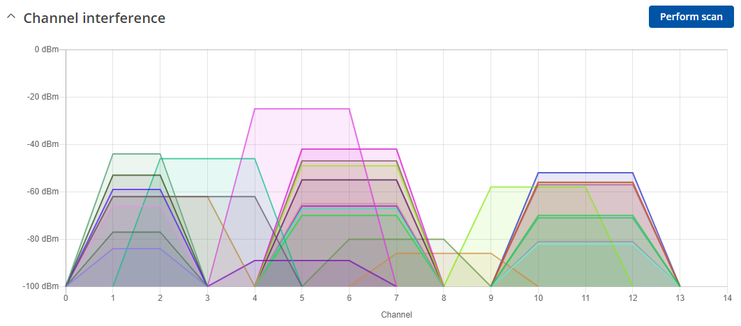 In firmware 7.5 Teltonika Networks engineers added a new channel analysis feature. It allows to perform a scan of the surrounding Wi-Fi signals and shows which signal occupies what channel. Then the device administrator can visually check the graph and set the Wi-Fi channel manually according to the findings.