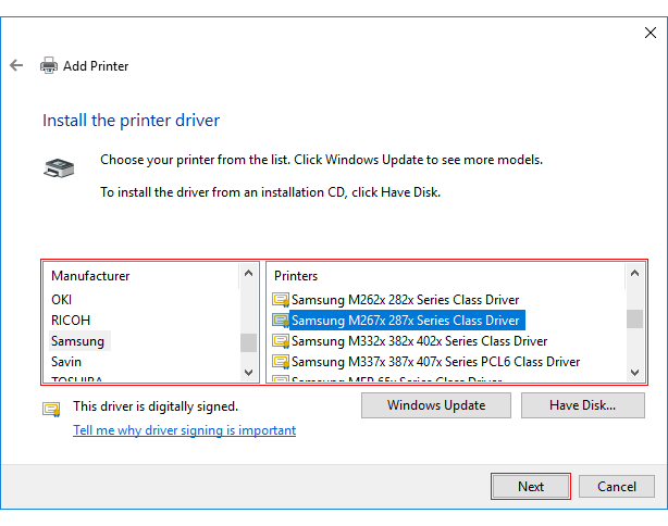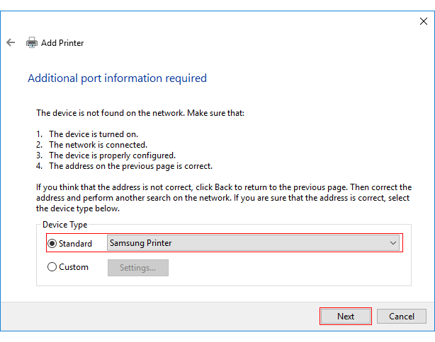 - In the next window, select Device Type: Standard, find and select your printer's manufacturer from the dropdown: