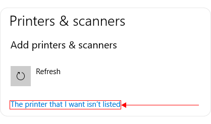 Most importantly - Enable the printer. - Open the Printers & scanners page on your PC. Click the Add a printer or scanner button and wait until the note "The printer that I want isn't listed" appears; click it: