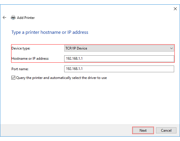 - Select Device type: TCP/IP Device, enter the router's LAN IP address and port name. For example: