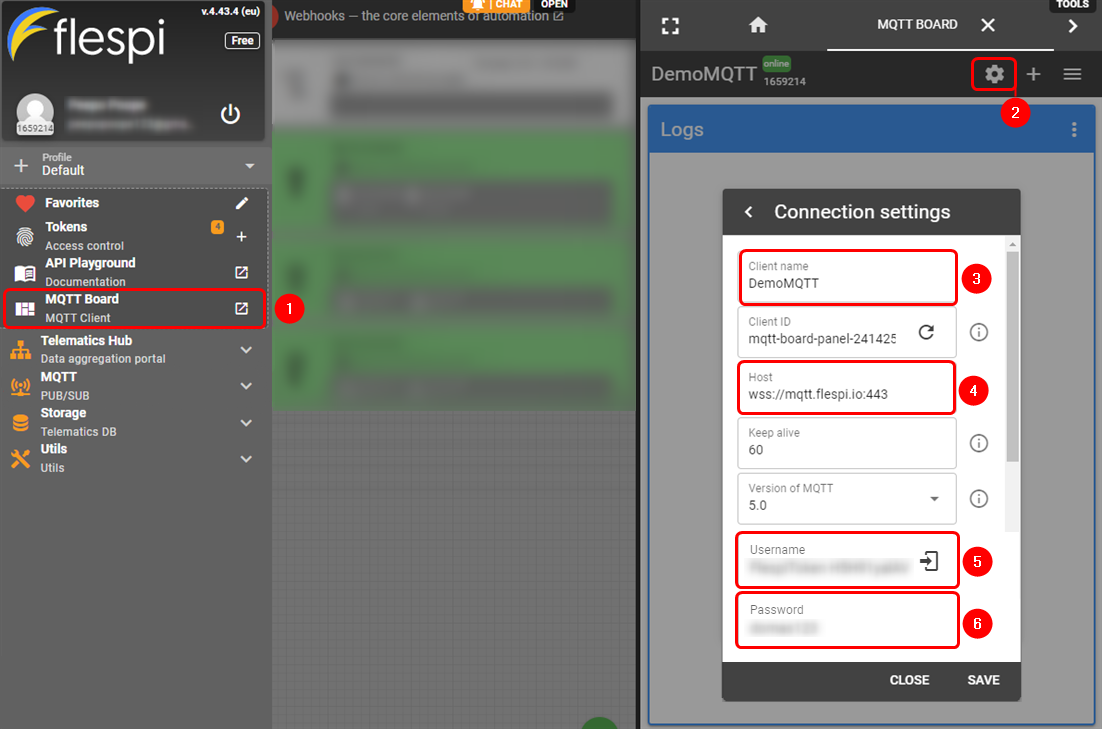 - Enter Host (copied from flespi connection settings without 'wss://' and port);