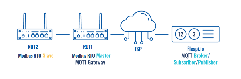 RUT2 will act as a Modbus RTU Server and RUT1 as a Modbus RTU Master. On RUT1, MQTT Serial Gateway will be configured to transfer Modbus data over MQTT. Flespi.io platform will serve as an MQTT Broker