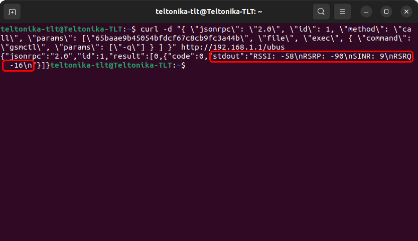 Highlighted in red is the Session ID. Replace it with the Session ID that was provided to you. Highlighted in orange is the command that we used for our query and highlighted in green is the parameter for the command: gsmctl -q.