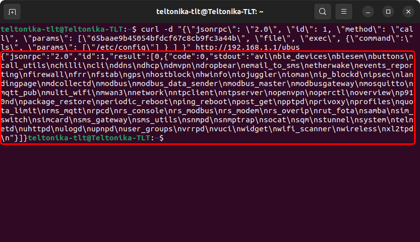 You can issue almost any Linux command in a similar manner. For example, if you wish to get a list of file names contained in the config folder, the Linux command to do so would be ls /etc/config, which, translated to JSON-RPC, would be: