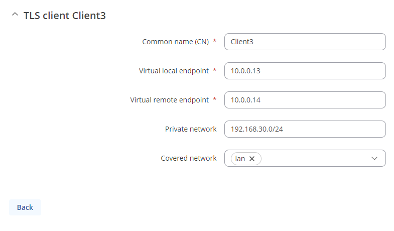 - Client 3 VPN tunnel address - 10.0.0.14, LAN device address - 192.168.30.178