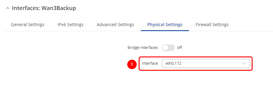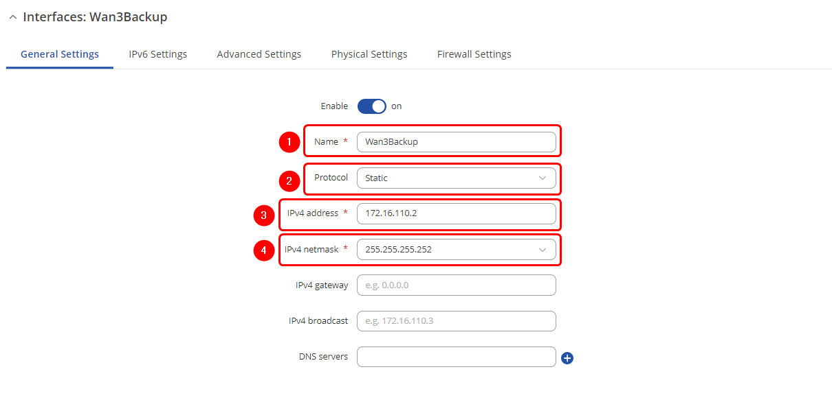 - Select Interface: eth0.172 (Wan3Backup) | Enable Interface: on