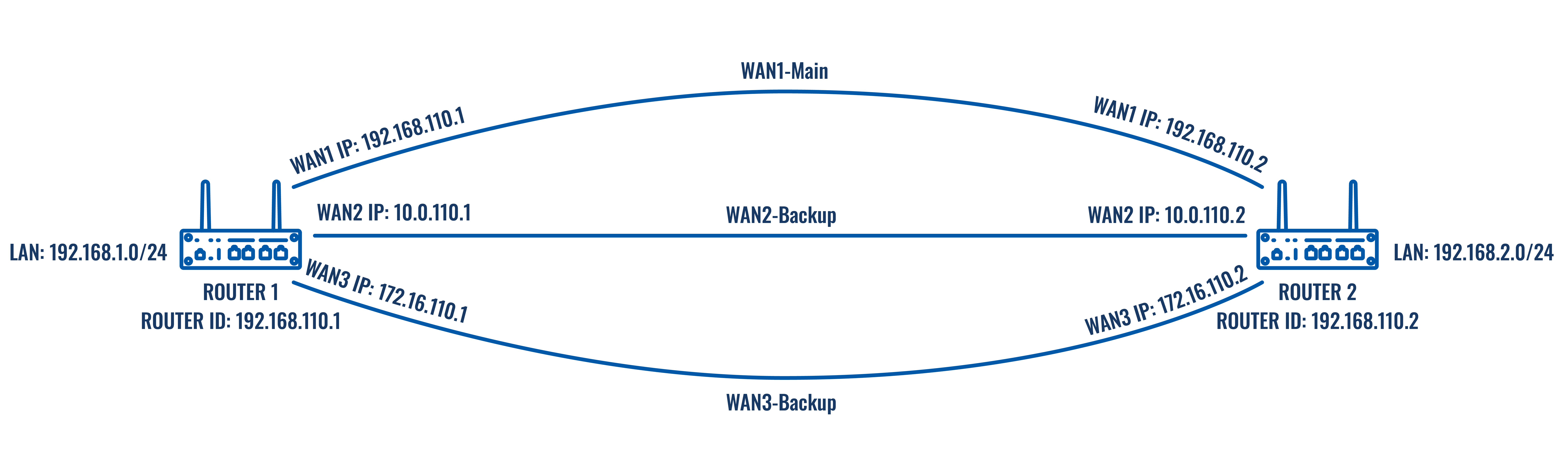 In this example we will setup redundant links using dynamic routing where 2 routers will be connected using multiple links directly – Main WAN and two Backup WANs in order to make sure LAN devices on each end would be available in case Main links fail.
