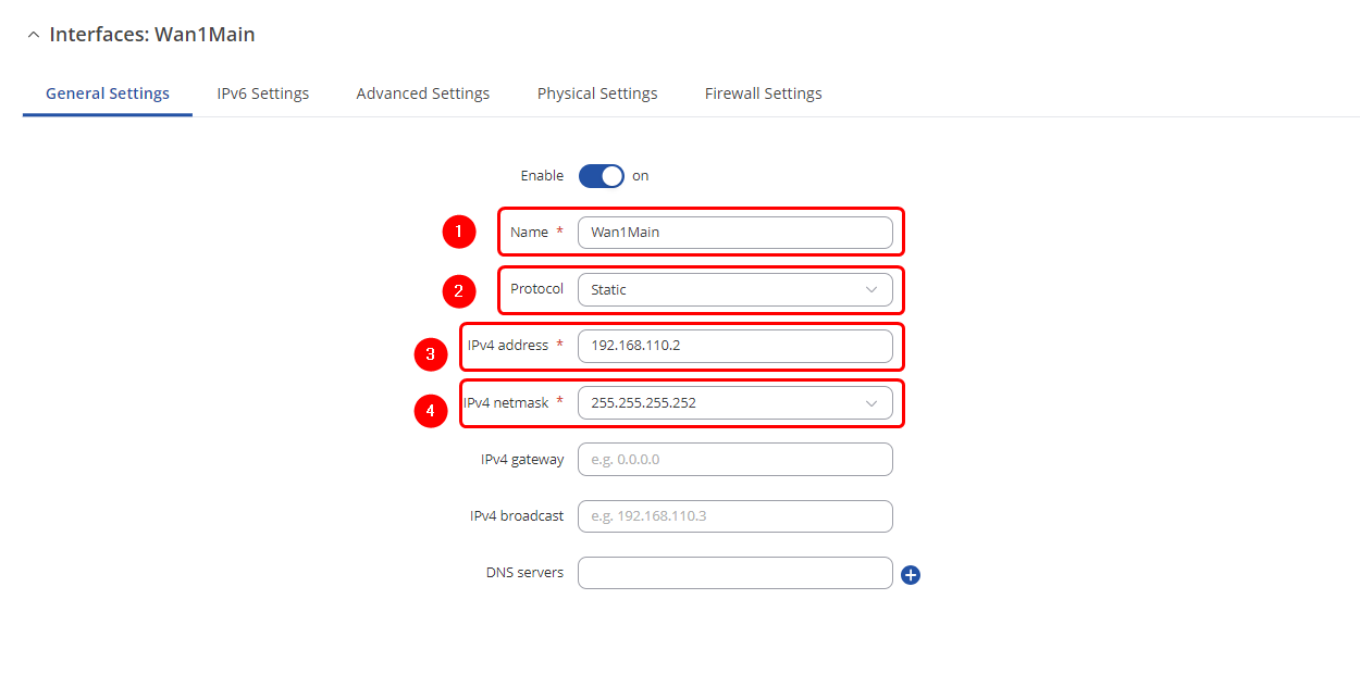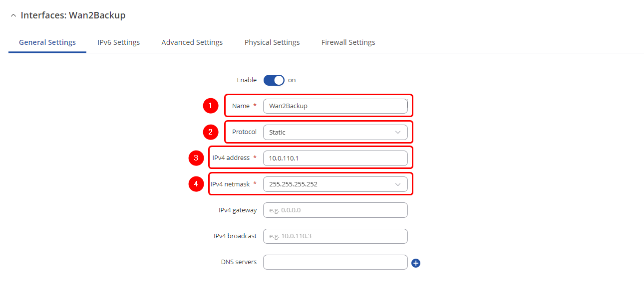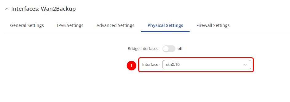 - Select Interface: eth0.10 (Wan2Backup) | Enable Interface: on