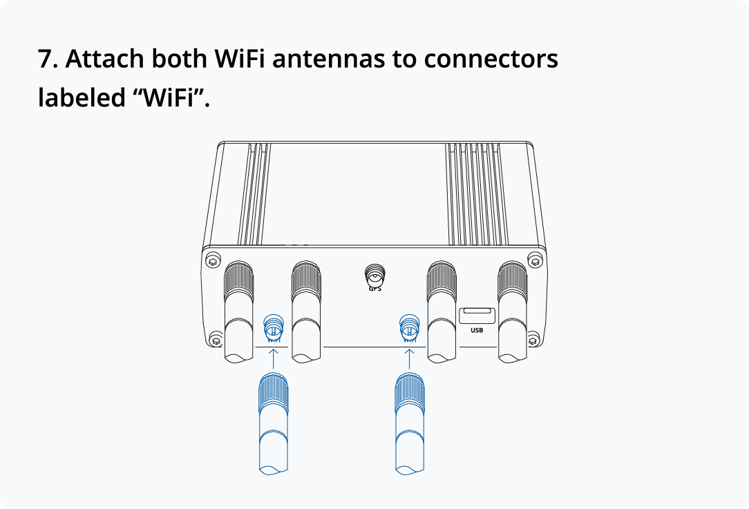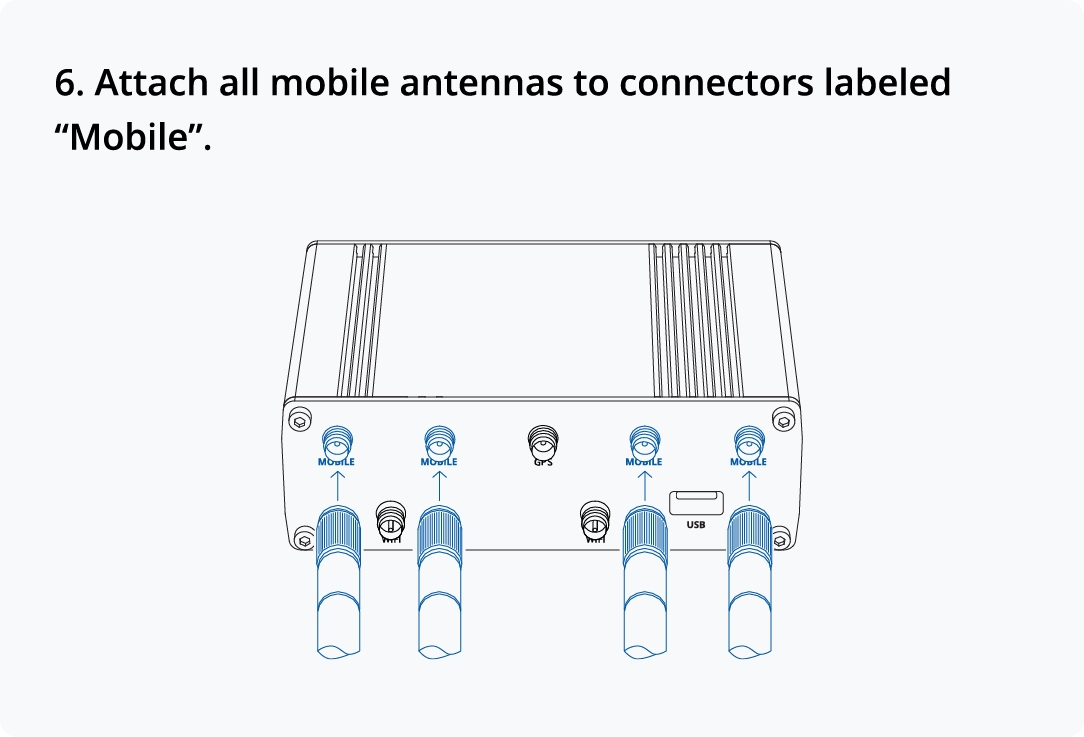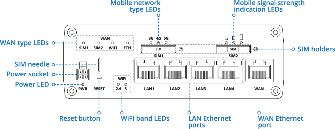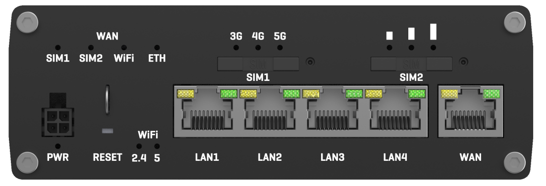 This Wiki page contains the online version of the Quick Start Guide (QSG) for the RUTM50 5G Router. Here you will find an overview of the various components on the front and back of a RUTM50 device, hardware installation instructions, first login information, device specifications, and general safety information. It is highly recommended to acquaint yourself with the Quick Start Guide before using the device. You can also locate a printed version of the Quick Start Guide in the packaging box of your device.