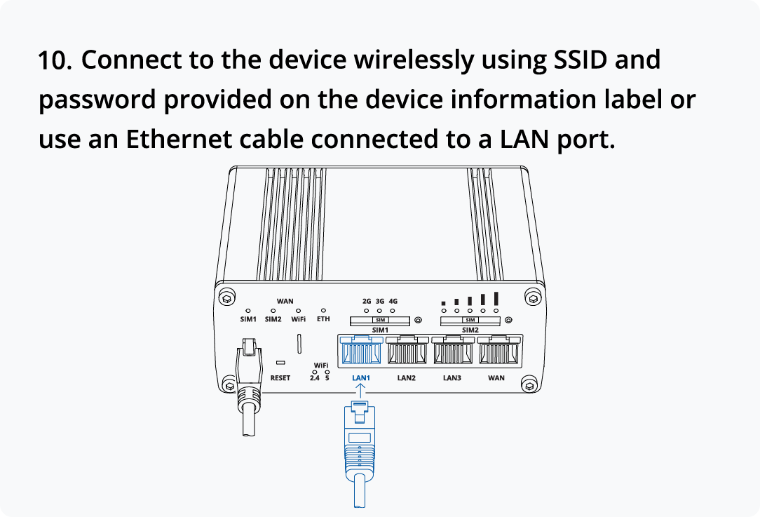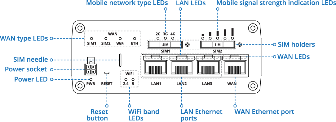 This Wiki page contains the online version of the Quick Start Guide (QSG) for the RUTX11 Cellular Router. Here you will find an overview of the various components on the front and back of a RUTX11 device, hardware installation instructions, first login information, device specifications, and general safety information. It is highly recommended to acquaint yourself with the Quick Start Guide before using the device. You can also locate a printed version of the Quick Start Guide in the packaging box of your device.