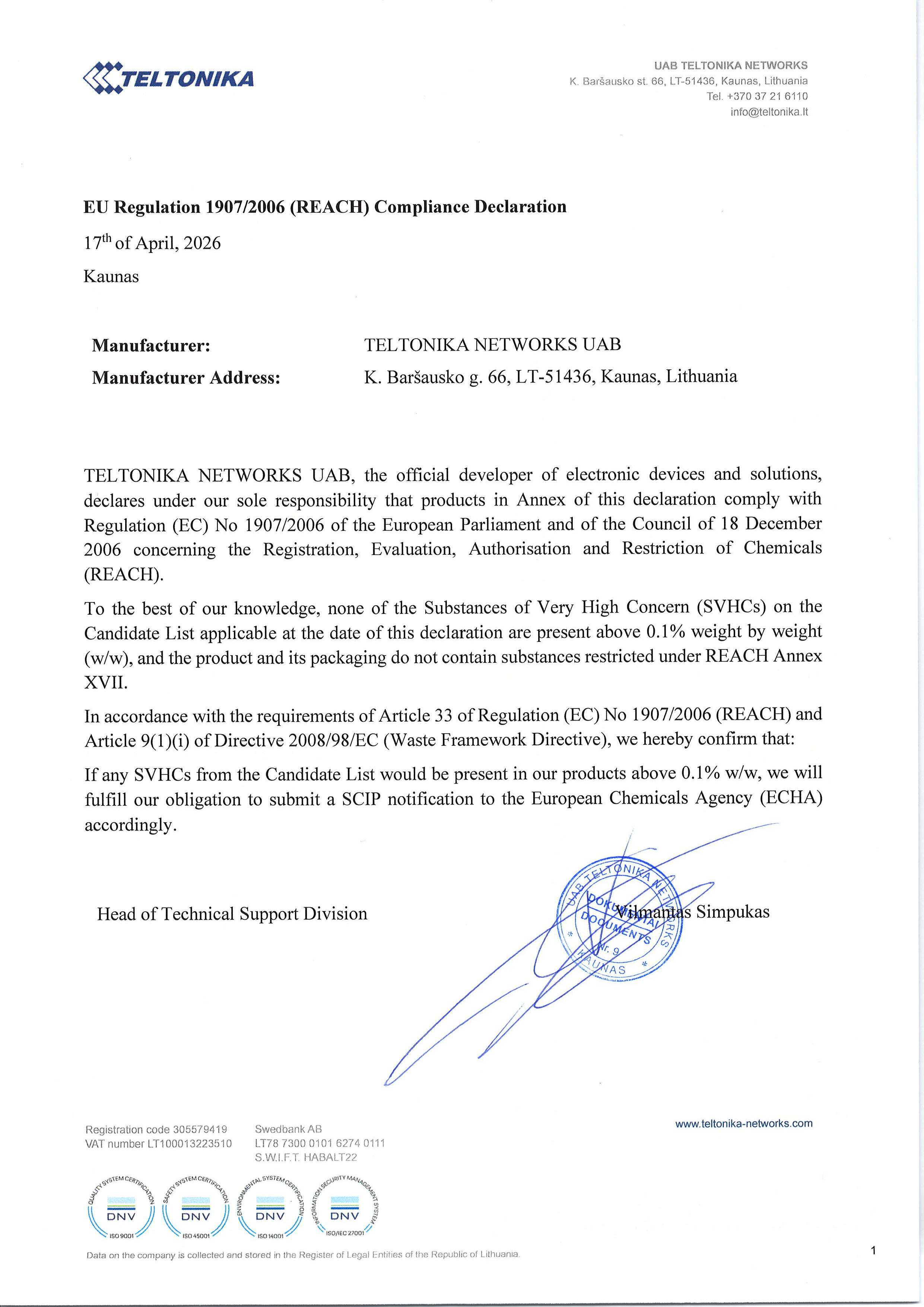 You can find PDF version of the REACH Regulation Declaration certificate here.