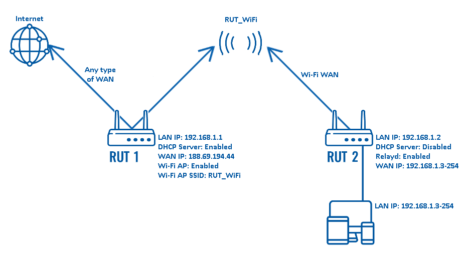 The scheme depicts two RUTxxx routers - RUT1 and RUT2. RUT1 has access to the Internet through an undefined type of WAN (it can be any). RUT2 acts as a WiFi Station (STA) and gains access to the Internet via RUT1's WiFi Access Point (AP) (SSID: RUT_WiFi). RUT2's DHCP Server is disabled. This is done so that the end devices connected to RUT2 get IP addresses from RUT1's DHCP Server with the help of Relayd.