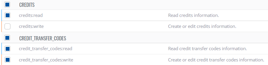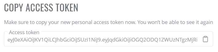 These scopes will allow us to read information about our current credits and credit codes, as well as create new credit codes. After selecting the necessary scopes, press Save Personal Access Token – you will be shown a table containing your Personal Access Token. WARNING: This is the only time the created access token will be shown, make sure to copy it, as you will not be able to see it again.