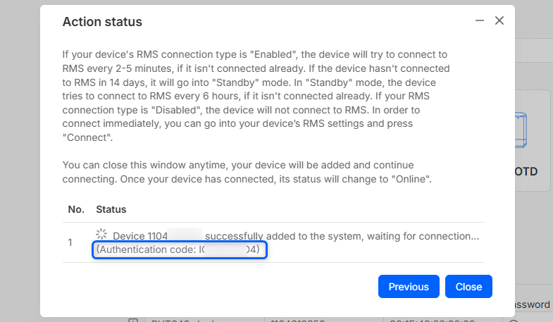 - In the field Authentication code, type in the code that was provided to you by RMS while adding the device. If you missed the authentication code during device registration, you can view it in the Device's details page in RMS or by changing table settings in the Devices page to display the Authentication code column.