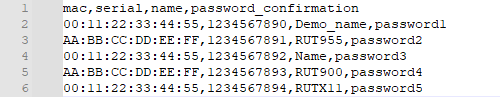 Each entry should consist of the device's LAN MAC address (or IMEI), serial number, and password separated by commas (,). Each line should contain information about a single device (see example below).