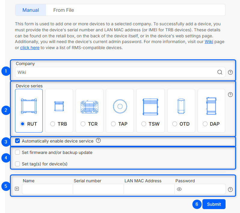 Adding a device is the main prerequisite to start using RMS. You can either add a device by manually entering the required name, serial, LAN MAC/IMEI and password or by adding devices from the file.