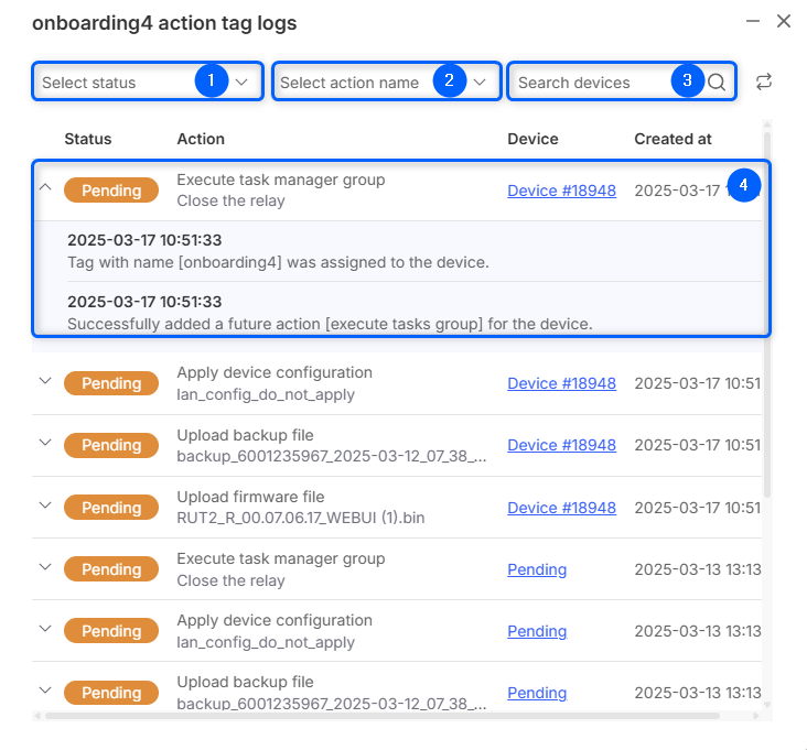 In the Tags page, in Actions column, by selecting on "page" icon an action tag logs window will be opened: