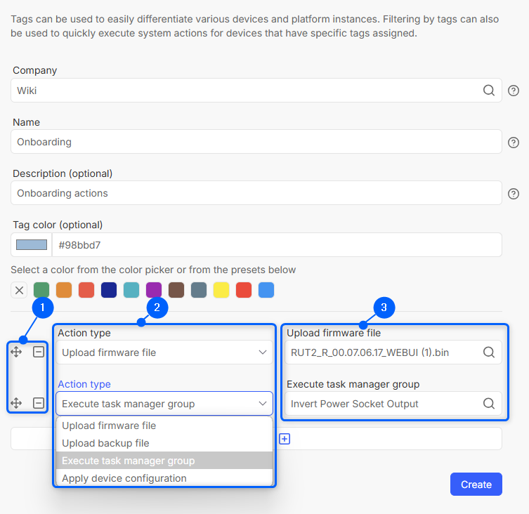 Action tag is tag with user selected actions inside it. This tag can be assigned on to devices, that RMS will execute on the specified order on online devices, or the action will be added to task queue and will be pending, until the device will become online on RMS.