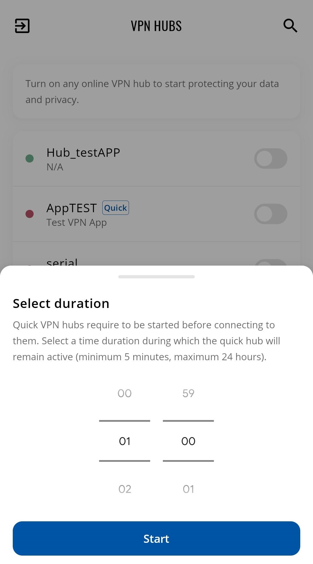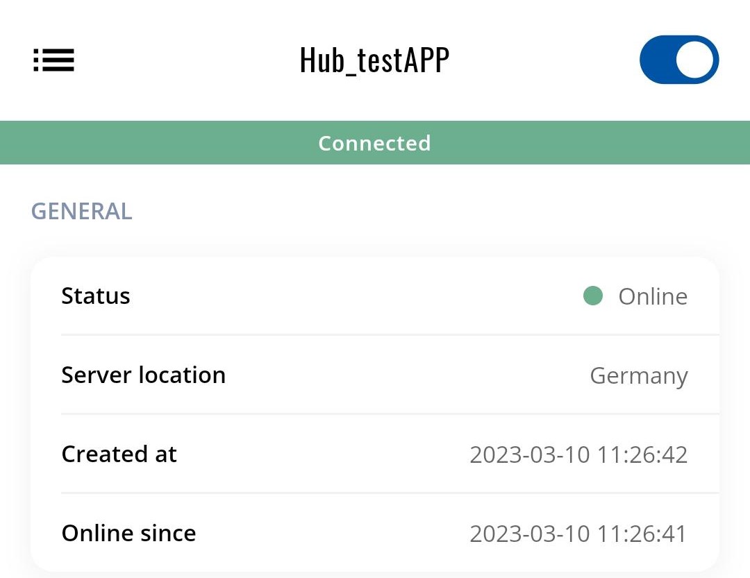 Here in the overview, you can check all available VPN hubs and Quick connect connections and start them.