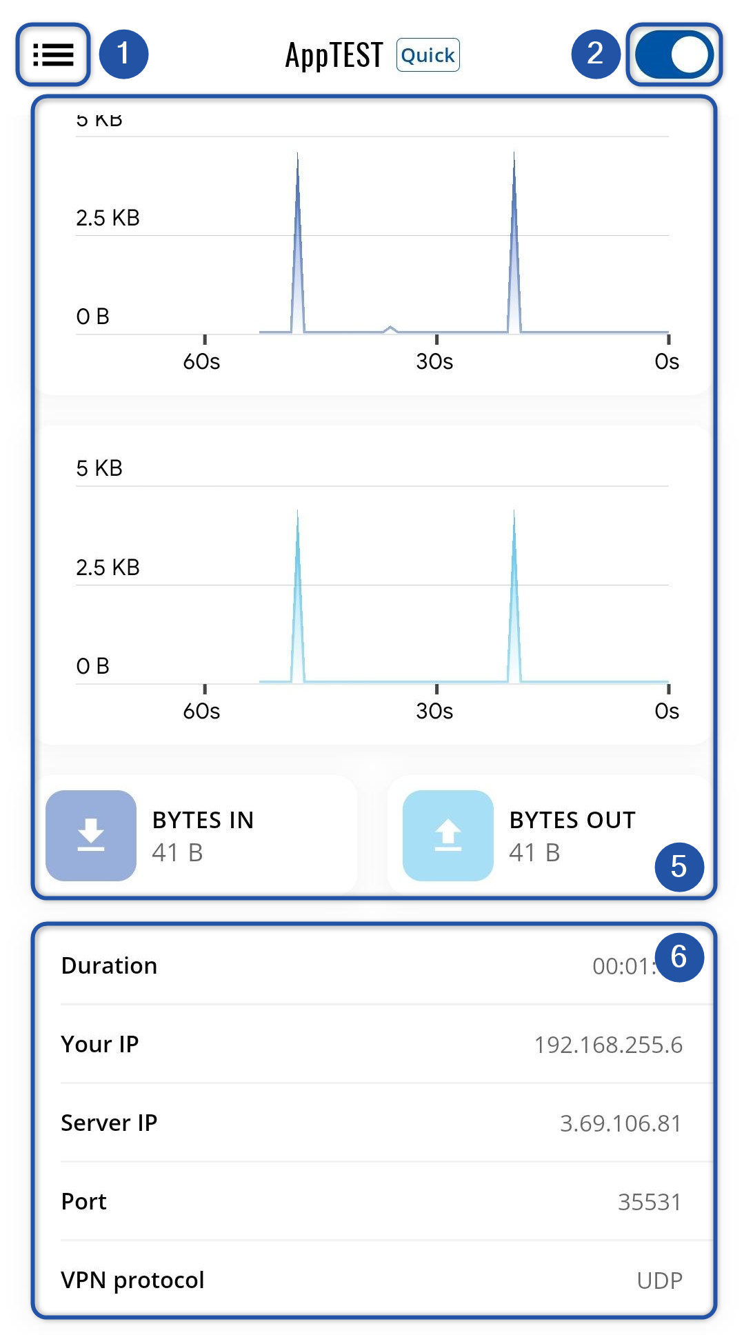- Other info about current connection: how long you've been connected, your virtual IP address in VPN, main server's IP address, port, and protocol.