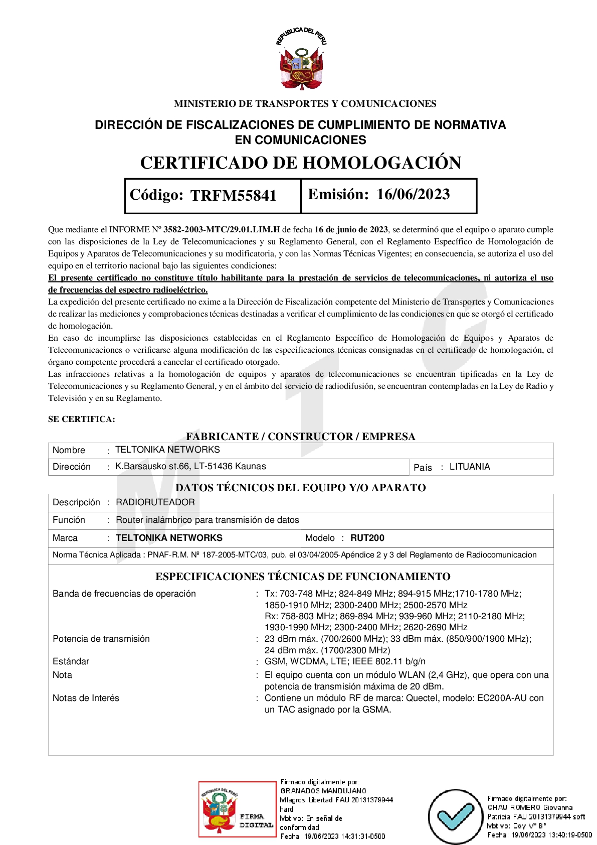 RUT200 devices are type approved for Peru.