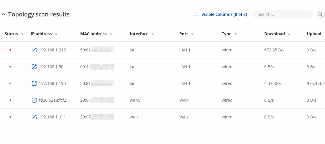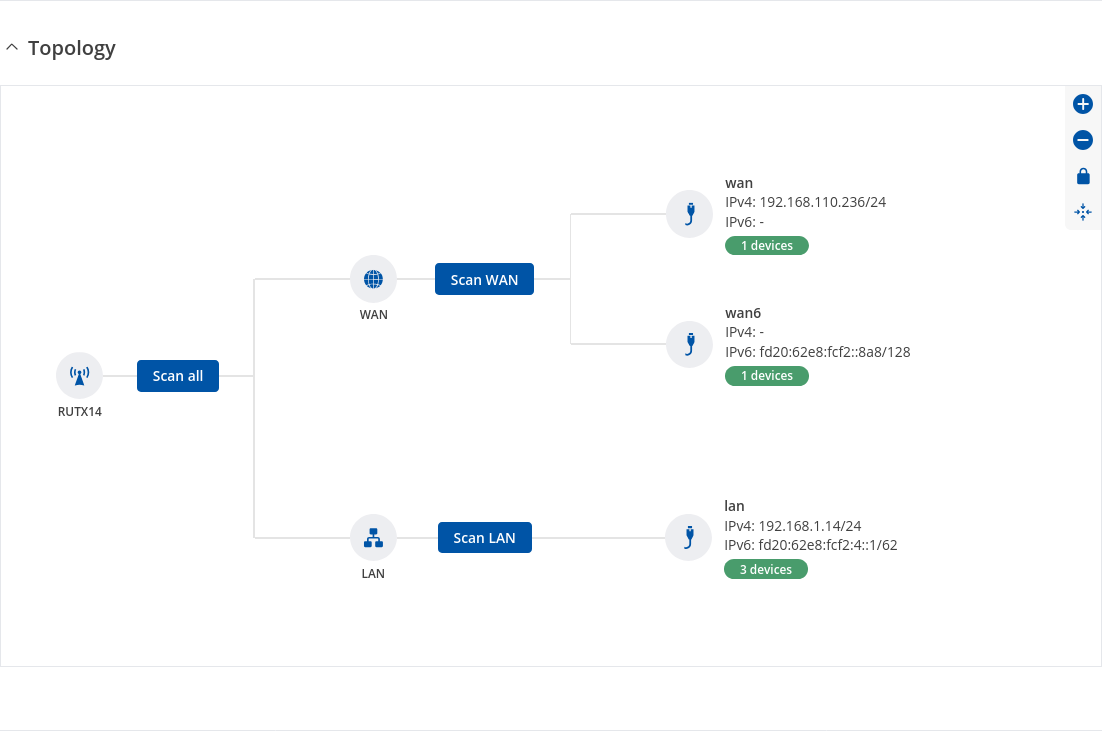 The Topology tab allows scanning of WAN, LAN or both interfaces via arp scan to check active connected devices. After scan it shows how many active devices were found and on which interface.